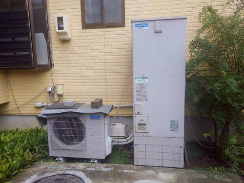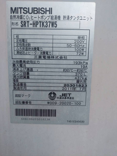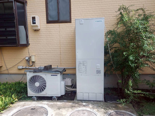 宮崎市清武町木原 三菱電機自然冷媒CO2ヒートポンプ給湯機 貯湯タンクユニットSRT-HPTK37W5→コロナ自然冷媒CO2家庭用ヒートポンプ給湯機ヒートポンプユニットCHP-DZ451K、貯湯ユニットCTU-37AZ1K エコキュート交換工事 施工前 施工後